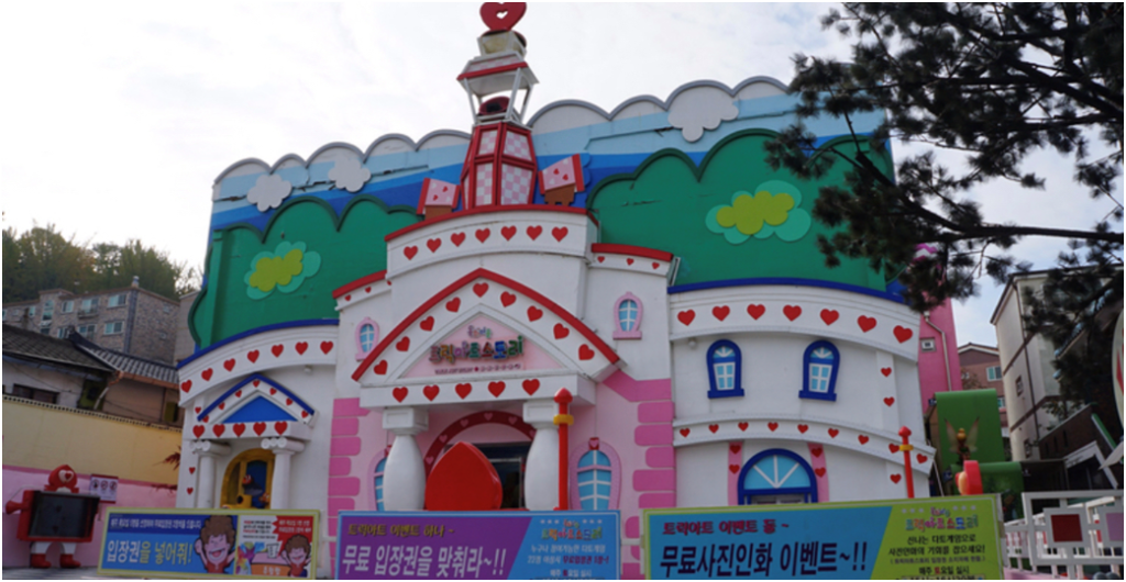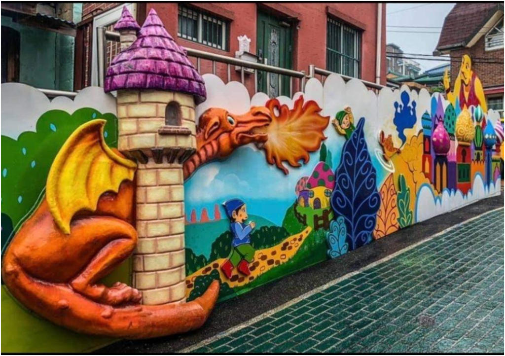 Bu alan 2013 yılında yeniden canlandırıldı ve masallardan muhteşem sahnelerle donatıldı. Fairy Tale Village’da harika sokak resimleri ve Kore ve Batı masallarına dayanan fotoğraf alanları bulunuyor. Instagram’ınız için eğlenceli fotoğraflar arıyorsanız, aralarından seçim yapabileceğiniz birçok harika mekan mevcut.