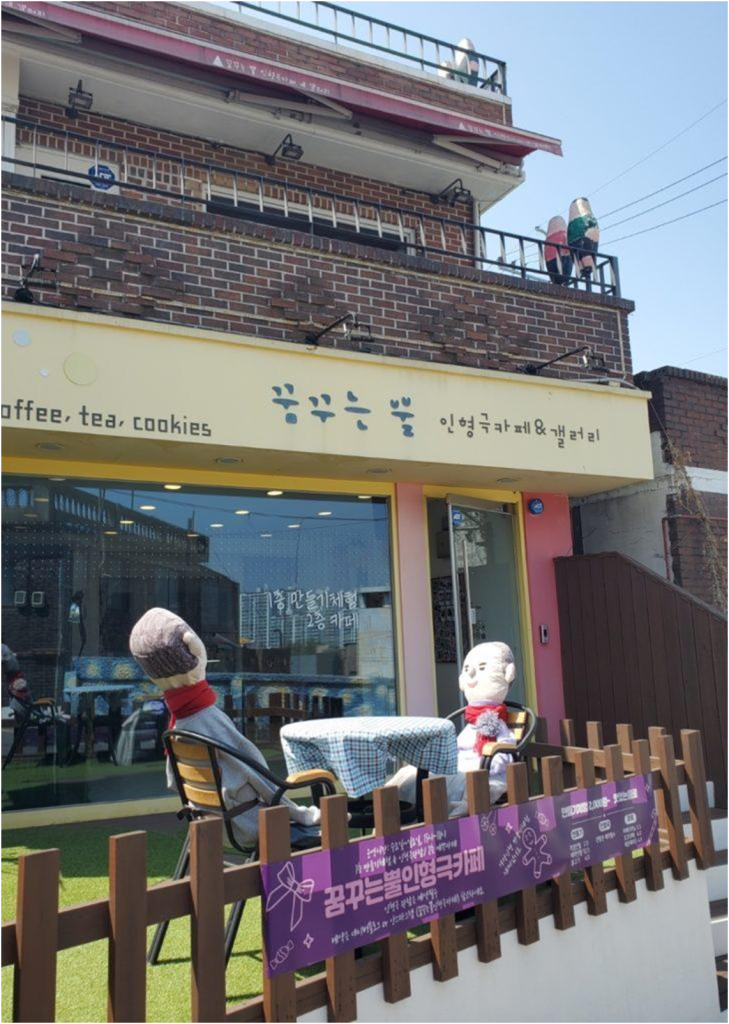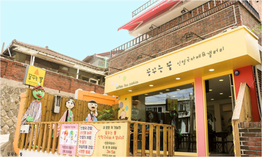 Donghwamaeul Kukla Gösterisi Kafe’si – 10:00 – 18:00, Salı ve Perşembe günleri kapalı. Ziyaretçiler içeceklerinin tadını çıkarırken kukla yapabilir ve kukla gösterilerini izleyebilirler. Üst katta çocuk kitapları ve yapı blokları var. Kafenin sahibi oyunlar oynadı ve küçük çocuğum için oyunlar getirdi.