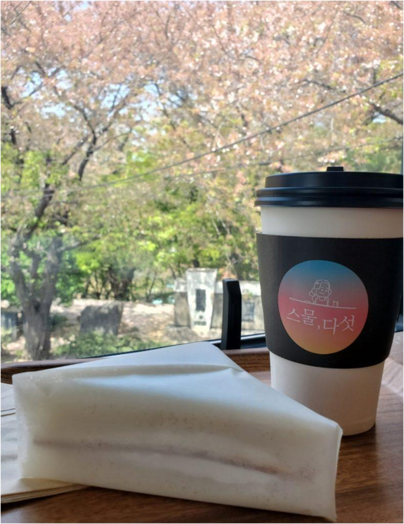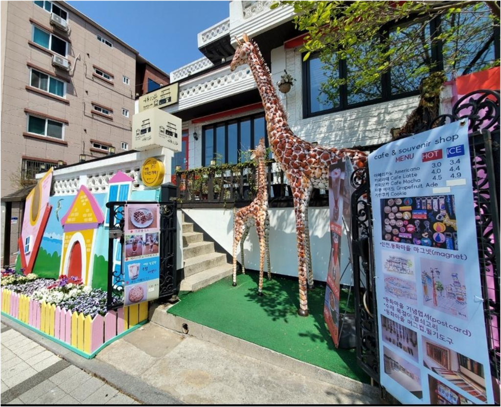 Umul Yeop Geu Evi – Önündeki zürafaları görmeniz mümkün değil. Zengin içecek menüsü, kurabiyeler, kartpostallar ve hediyelik eşyalar.