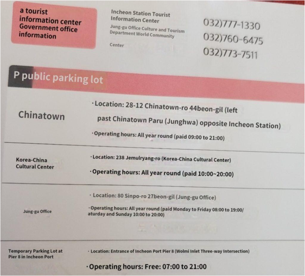 Incheon Jung Gu’daki Halka Açık Otoparklar