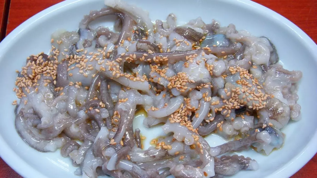 Noryangjin Balık Pazarı Deniz Balığı Merkezi’nde filizlerle süslenmiş çiğ ahtapot yemeği.