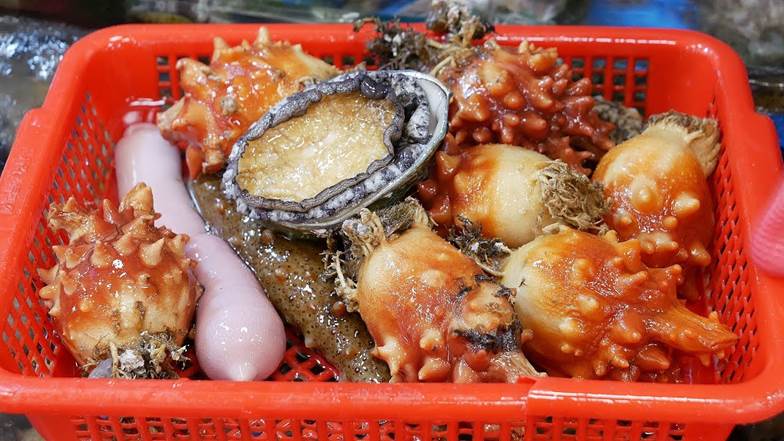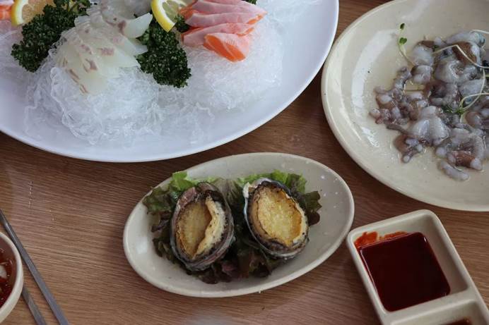 Abalone ( Deniz kulağı. Deniz salyangozu ) çok çiğnenebilir ve tereyağının kokusuyla birlikte harika bir deniz ürünü olmakta ve denenmesi tavsiye edilmektediSea Fish Center’da çeşitli taze balık dilimlerinin yer aldığı sashimi çeşitleri tabağı.