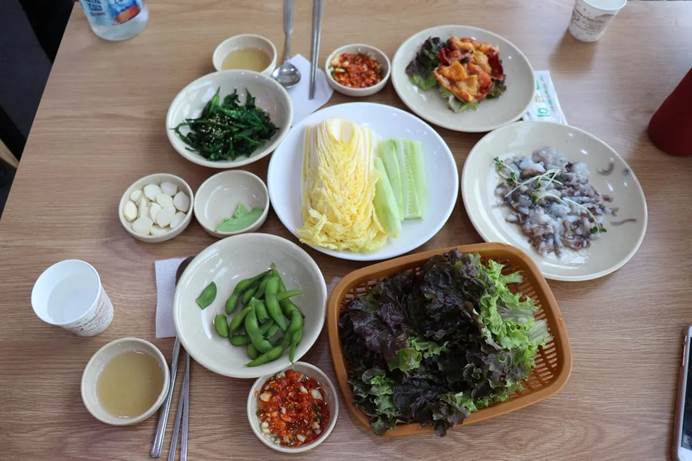 Noryangjin Balık Pazarı’ndaki Sea Fish Center’da servis edilen çeşitli Kore garnitürleri.