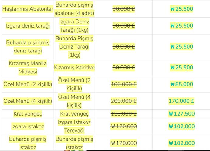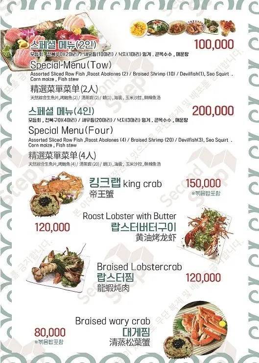 * Özel Menü (2 kişilik): Çeşitli sashimi, ızgara abalon (2), buharda pişirilmiş karides (10), küçük ahtapot (1), deniz tulumu, mısır, baharatlı deniz ürünleri çorbası